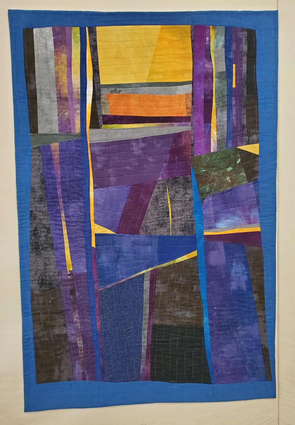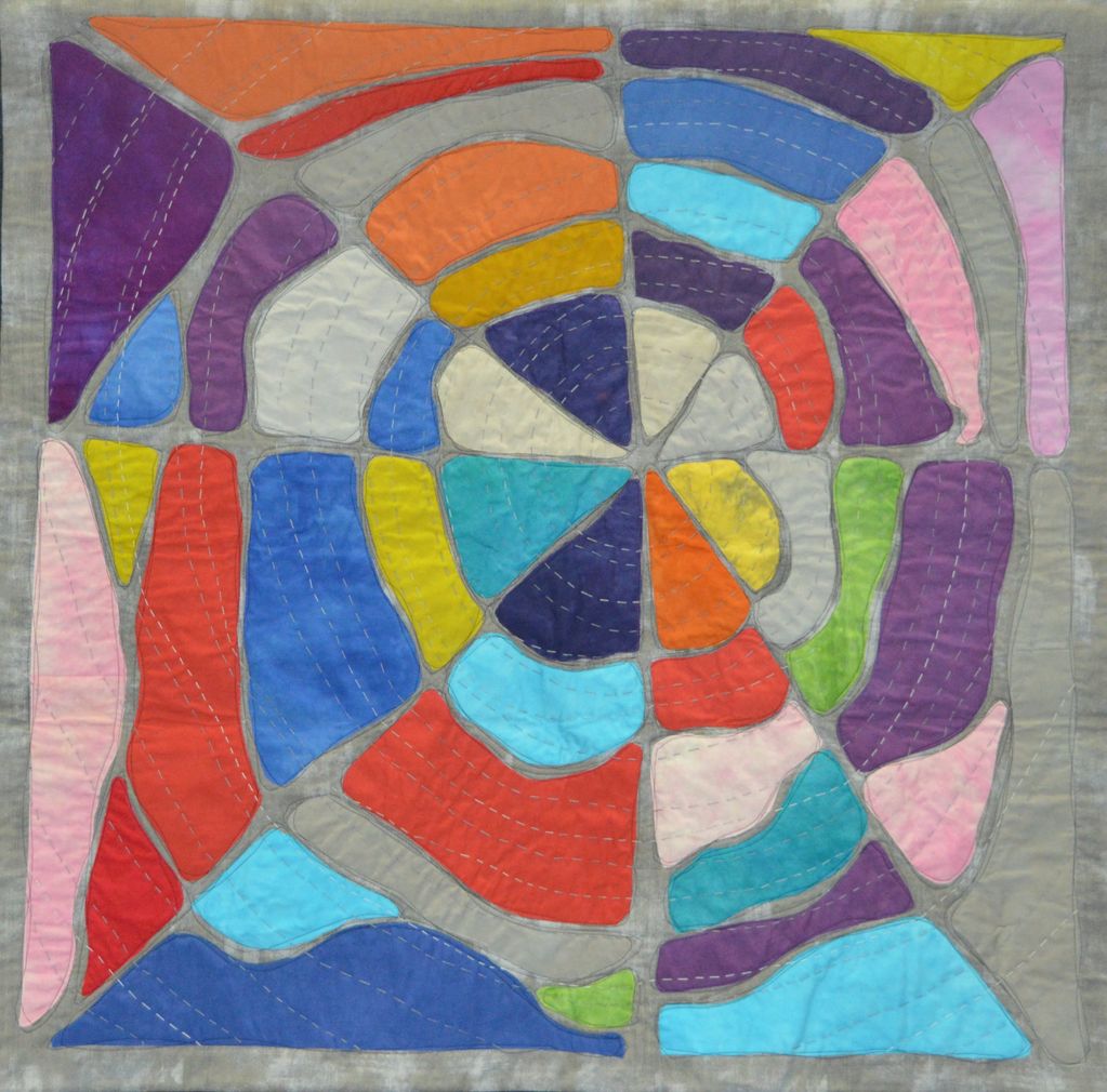 I made this for a challenge posed by a small quilt group I belonged to. It was inspired by three blocks I made in a Rosalie Dace class that were supposed to use color to illustrate a mood. I started with the sunny yellow block in the top center.