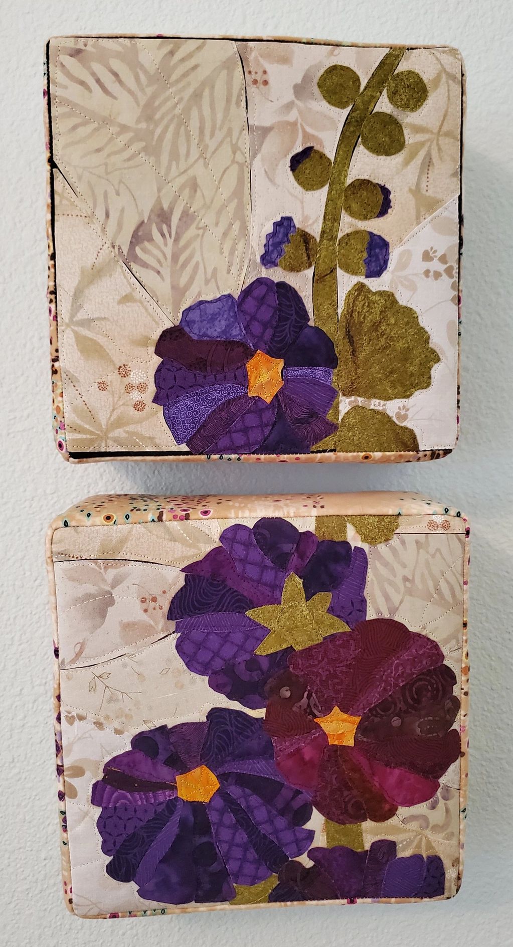 Using a technique I learned from Jean Wells Keenan of Stitchin Post fame I adapted a Ruth McDowell Hollyhock design to make these wall tiles.
