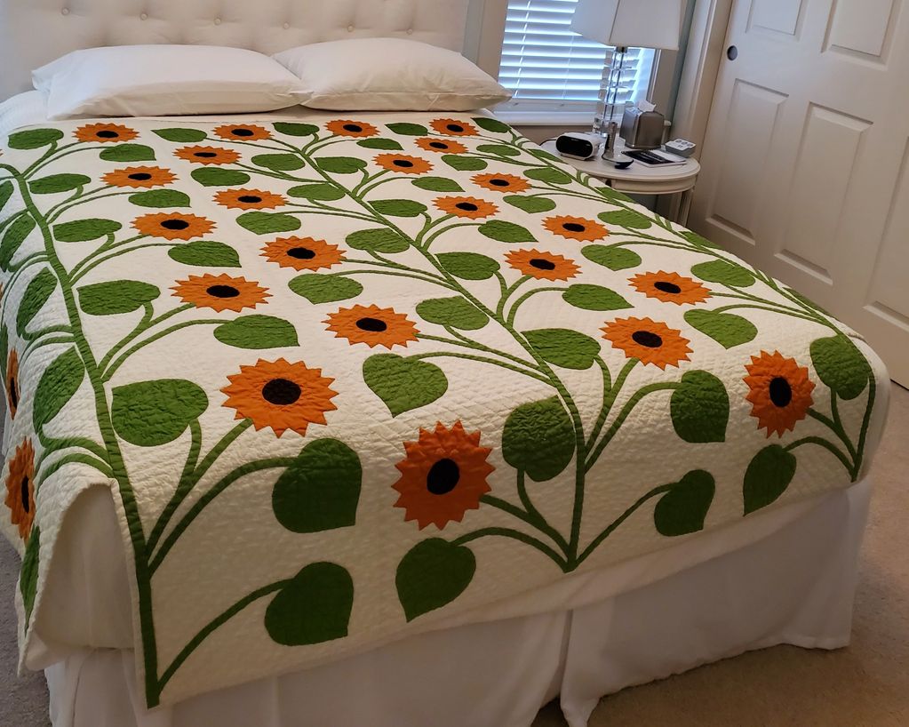 I really like hand appliqué. There are 32 sunflowers and each one has 16 peaks and valleys. It sounds daunting, but this was a truly satisfying project. I treasure this quilt above all others.