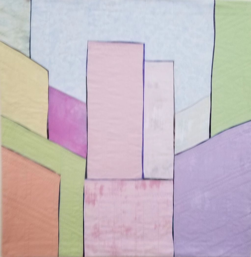 After thinking and working on the "Cities" theme for months, I wore from a dream about an ethereal city of pastel buildings. The challenge here was to find the pastel fabrics. Several are the backside of printed fabric.