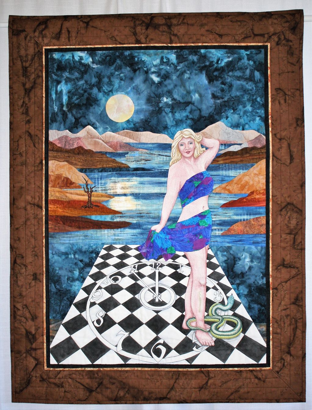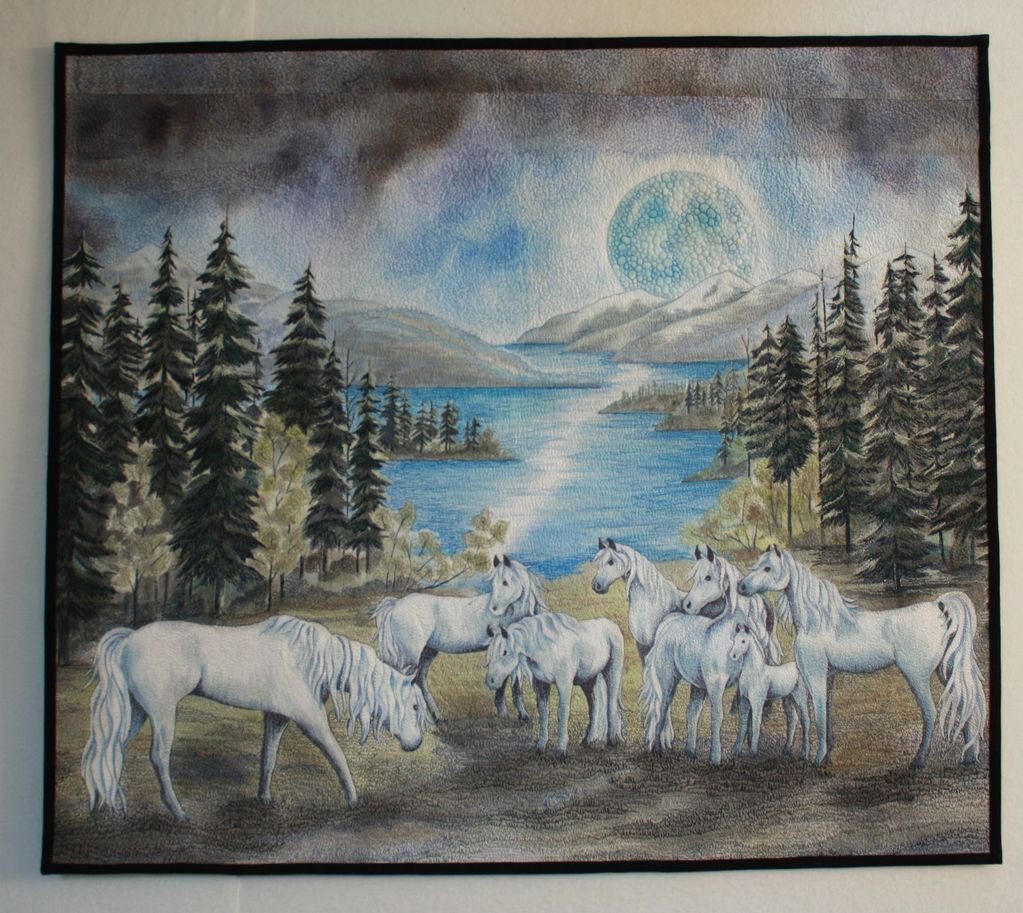 Love horses so decided to make a fantasy scene with a 'Blue Moon' and horses. The horses are thread painted and the rest of the scene is painted and heavily quilted. It is made to be viewed from both sides. It is quilted on a domestic machine.