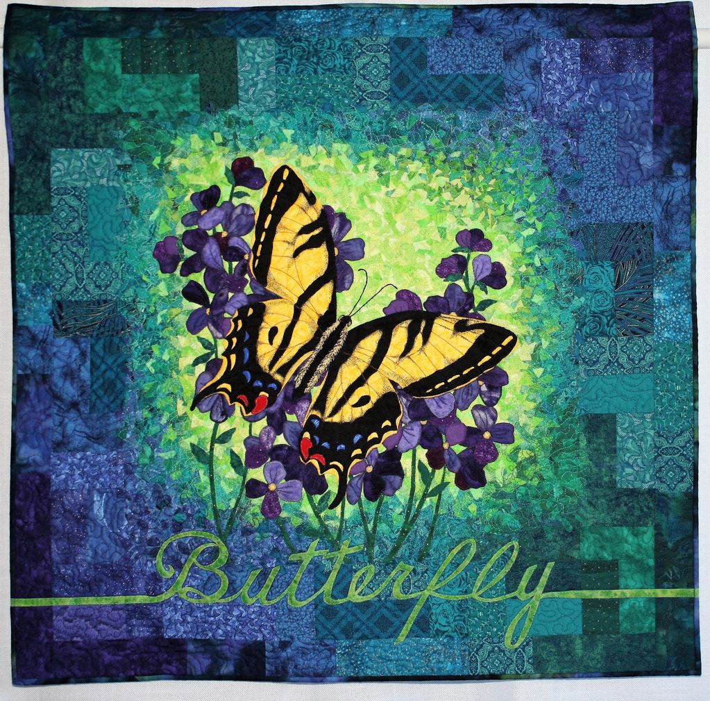 This quilt was made for the Art Quilt Group challenge: "Green Line."' The butterfly is fused appliqué, some paint, some ink, some thread painting and embroidery. Background is the confetti technique with tulle over it. The lettering 'Butterfly' is the Green Line challenge and extends into the binding.