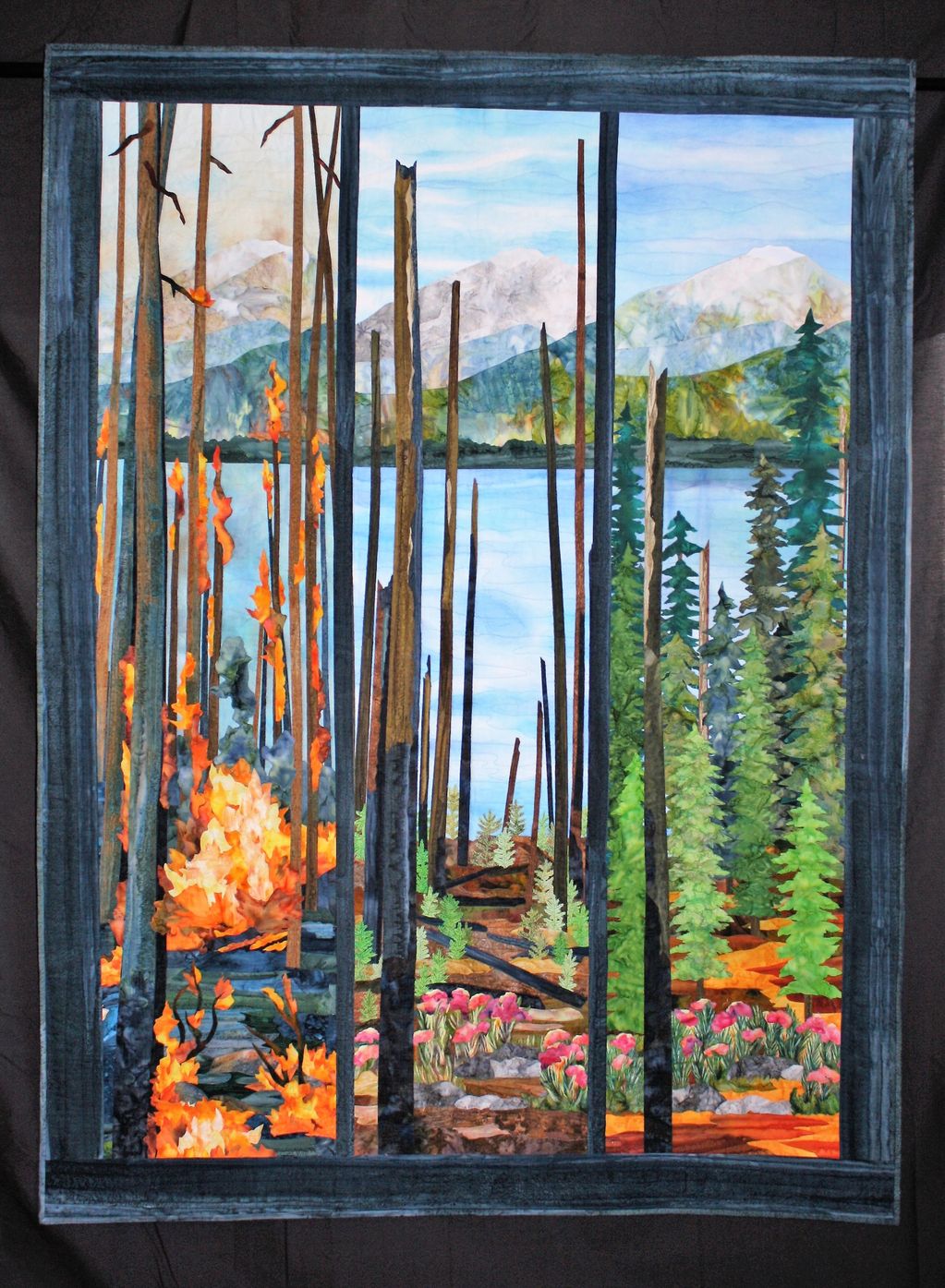 This quilt was made after reading the book, 'My Kitchen Year' by Ruth Reichl. She was the editor of Gourmet Magazine when it was decided it would no longer be published. She was devastated. Her life went in a new direction. The forest fire scene represents how from the ashes there are new beginnings - a new hope. Some pine co