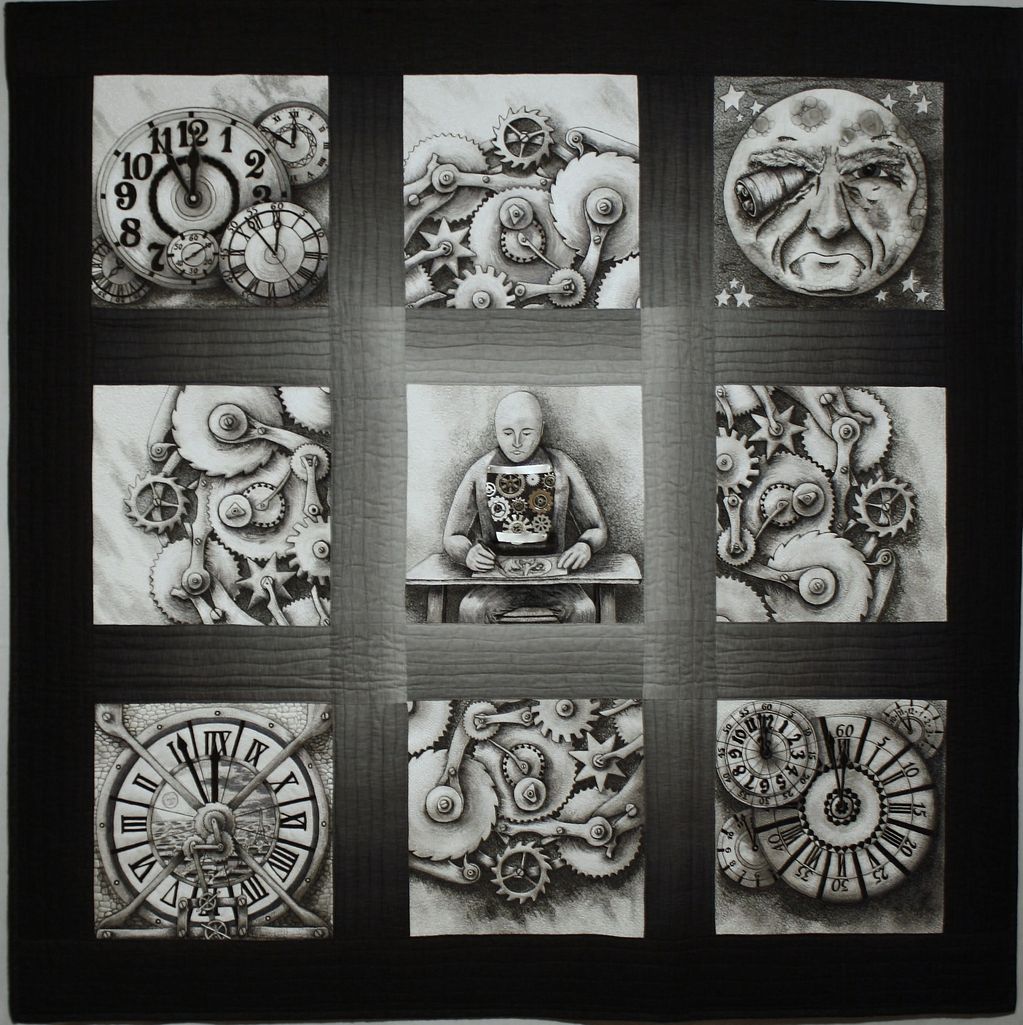 Quilt was made for two challenges. A book club challenge: 'The Invention of Hugo Cabret' and an Art Quilt Group challenge of a series of three. The drawings are original, but based on the book. The densely hand guided thread painting in this quilt is on a 'value scale' from black to white. The quilt is made to be viewed fr