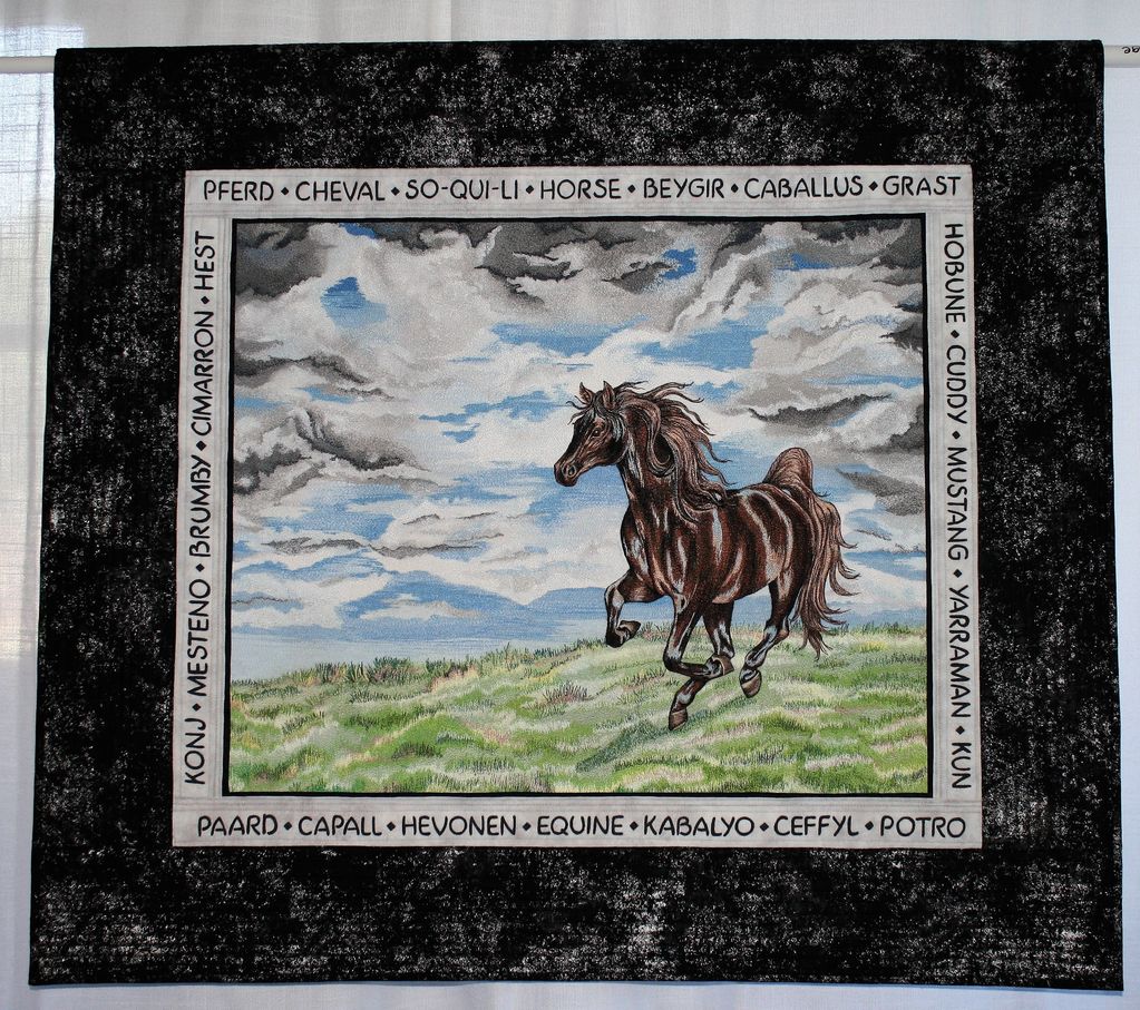 This quilt was made to be viewed from both sides. It was designed and then hand guided thread painted. On the inner border the word 'horse' is thread p