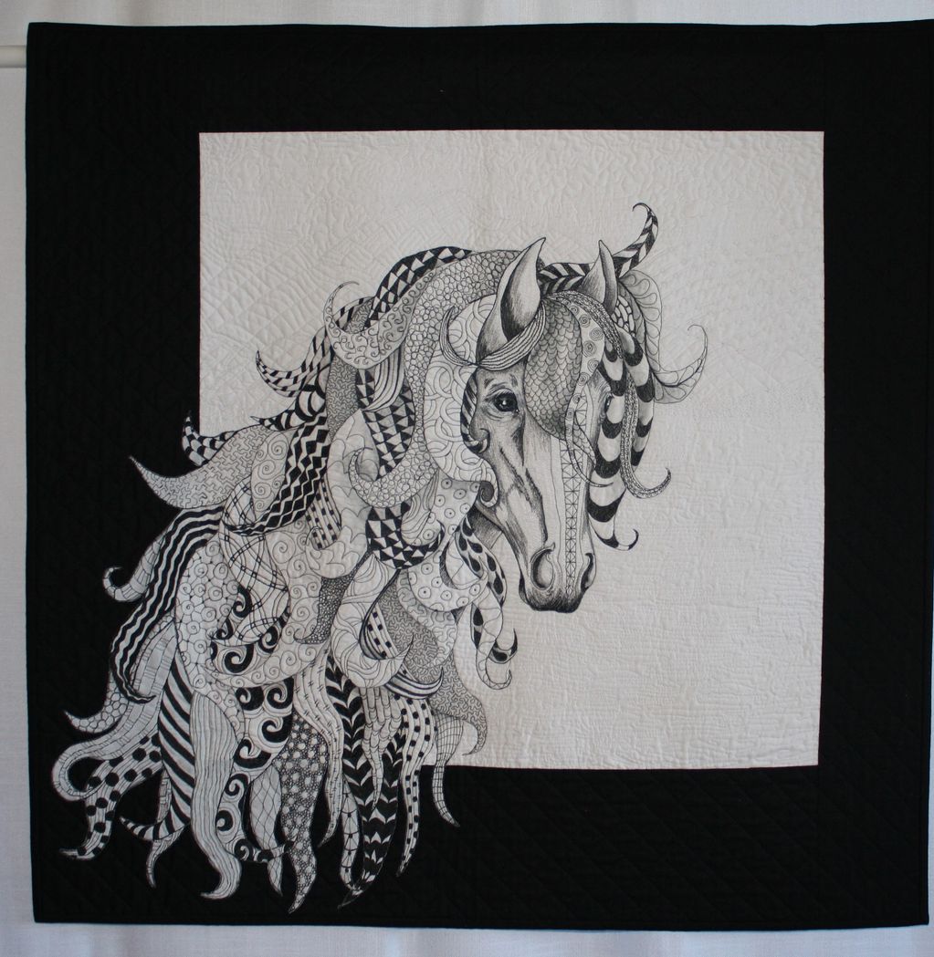 Quilt was made on a domestic machine for a Zentangle Challenge. The horse was drawn with the intention of his mane being thread painted zentangles. Shading in this quilt is done with thread painting in the face and mane of the horse and some light color pencil shading on the mane. Background is white on white zentangles.