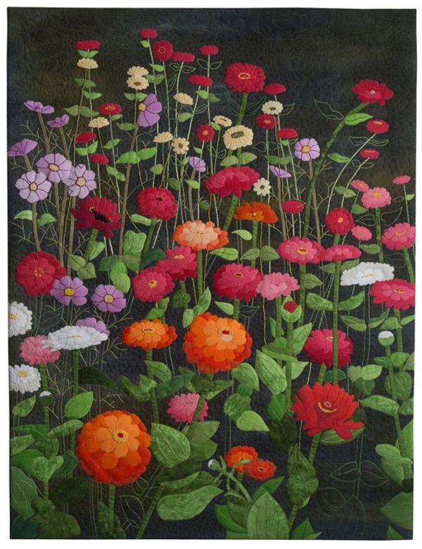 My goal in designing the quilt was to give the viewer the feeling of gazing into a lush garden. What I enjoyed about creating this quilt was that it brought together my skills and knowledge beginning with designing stylized flowers for an original design then bringing it to life with machine and hand embroidery, hand-twisted cords, and machine quilting.